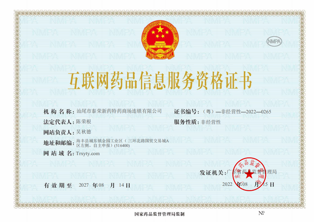 互聯(lián)網(wǎng)藥品信息服務(wù)資格證書 :(粵)一非經(jīng)營性- -2022- -0265